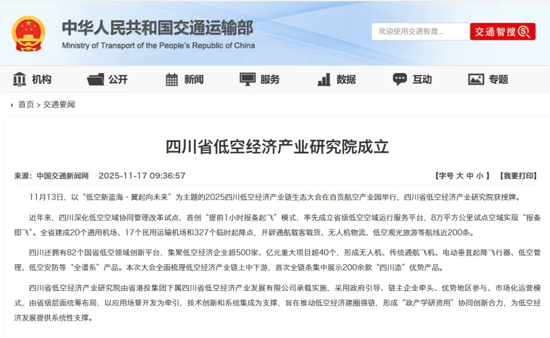 11 月 13 日,以 “低空新蓝海・翼起向未来” 为主题的 2025 四川低空经济产业链生态大会在自贡航空产业园举行,四川省低空经济产业研究院正式获授牌,省委副书记、省长施小琳为研究院揭牌并强调,要加快打造西部低空经济发展高地,推动战略性新兴产业集群化发展。